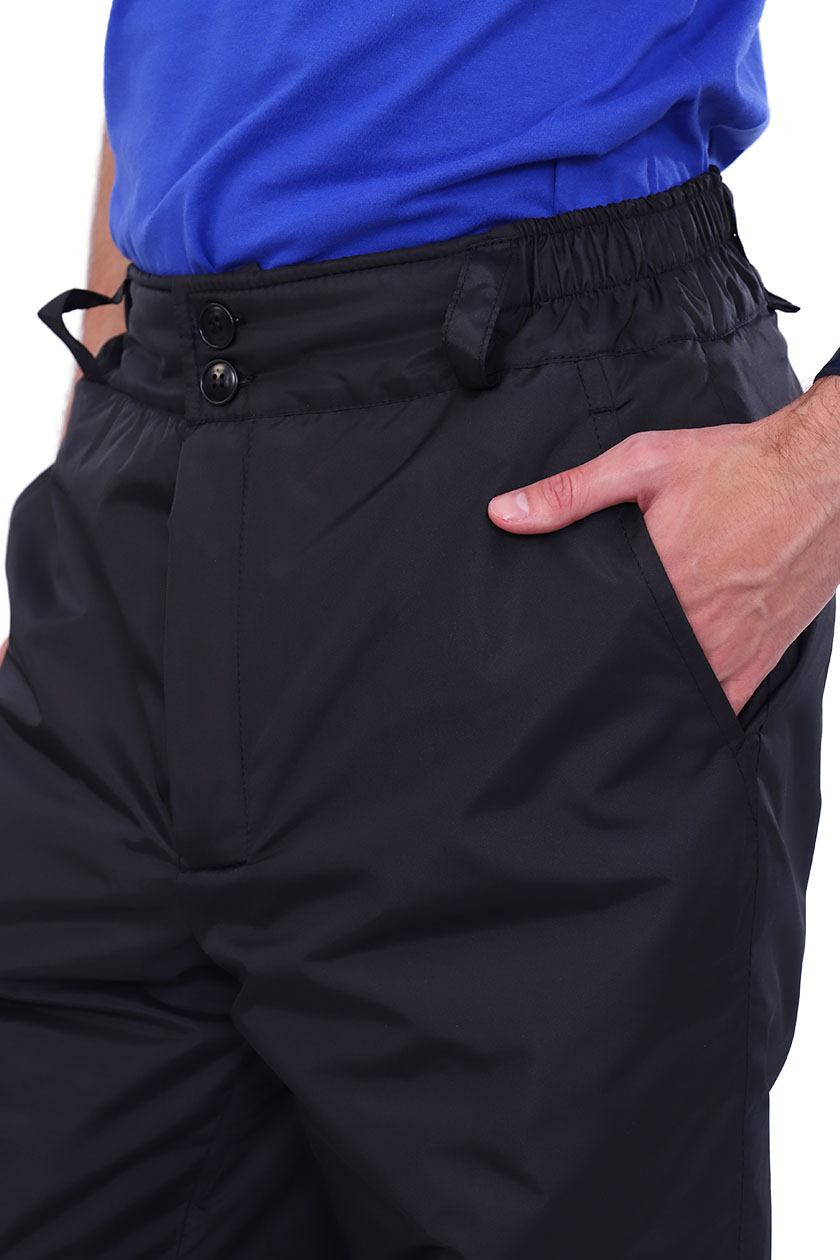 Брюки мужские утепленные прямые с широким притачным поясом, частично на резинке, с пятью шлёвками. Два боковых кармана, застёжка гульфа на молнию. По низу брюк внутри снегозащитная муфта.