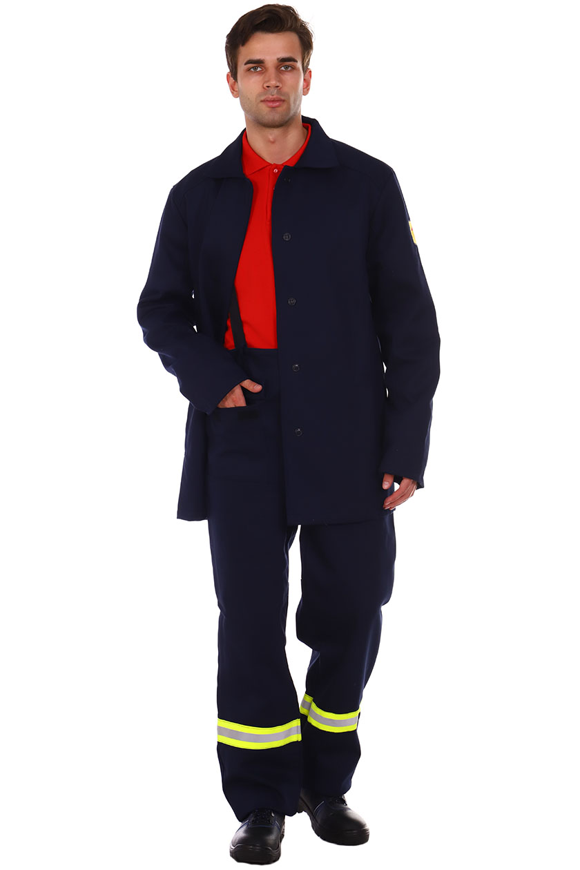 ➠ Брюки с притачным поясом, застежка гульфика на пуговицы. На правой передней половинке – накладной карман с клапаном. Передние половинки с усилительными накладками от линии бедра до низа с заходом на боковые швы. Брюки с бретелями. Нитки и фурнитура огнестойкие. По низу брюк расположен СОП 50 мм, огнестойкий.